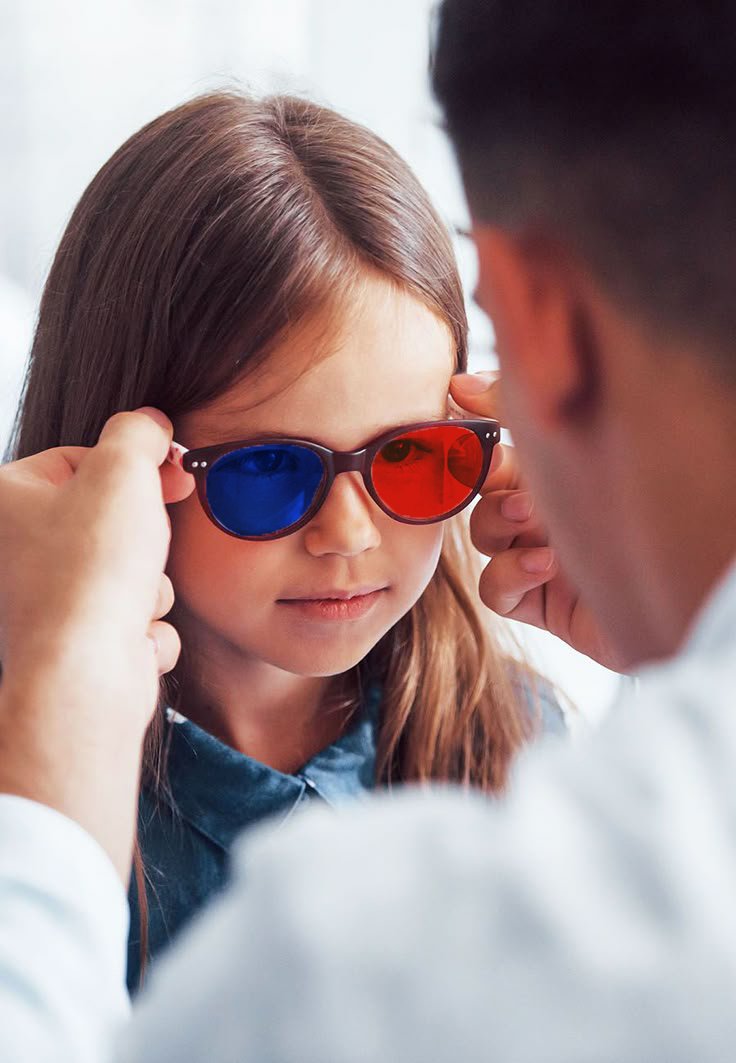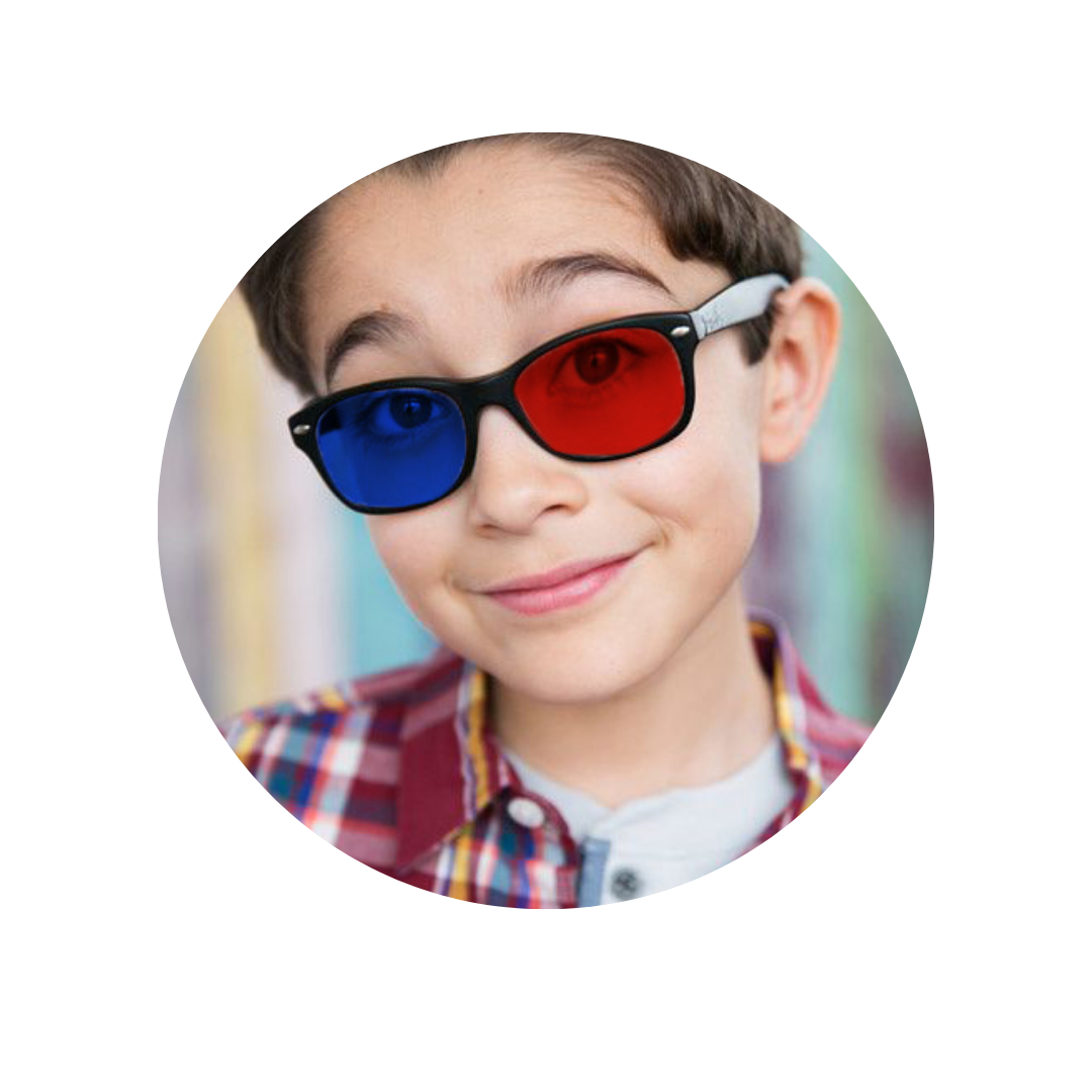 Using red and green glasses we separate visual stimuli for each eye. By engaging both eyes independently, we strengthen each eye individually, as well as teach them how to work together simultaneously. This leads to greatly improved binocular vision.